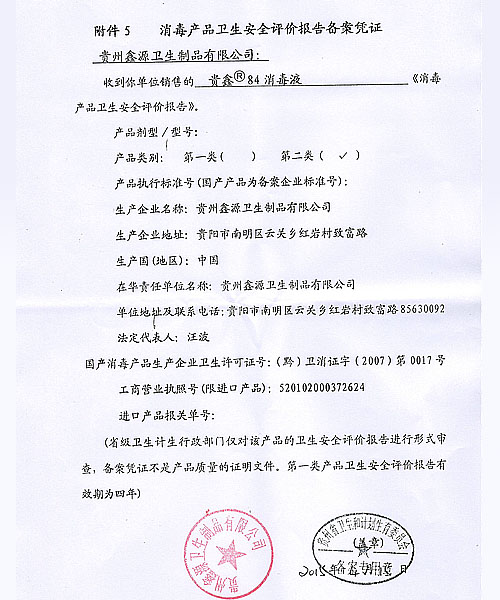名 称:贵鑫84消毒液《消毒产品卫生安全评价报告》